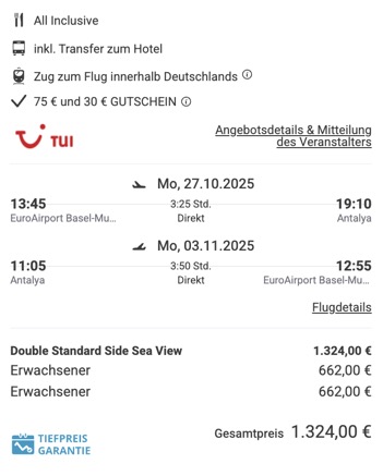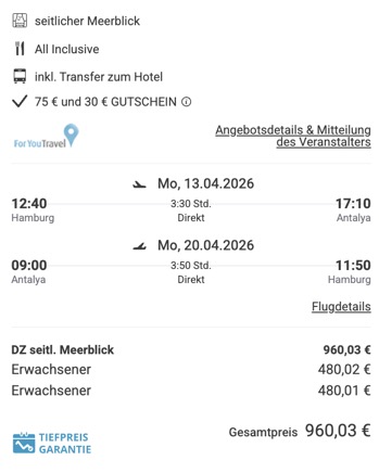 Alle hier genannten Reisepreise sind mit der Veröffentlichung des Deals verfügbar und buchbar, jedoch haben wir keinen Einfluss darauf, wann und wie stark sich ein Reisepreis verändern kann. Wenn die Nachfrage besonders hoch ist, kann der Flugpreis sich besonders schnell verändern und Unterkünfte ausgebucht werden.