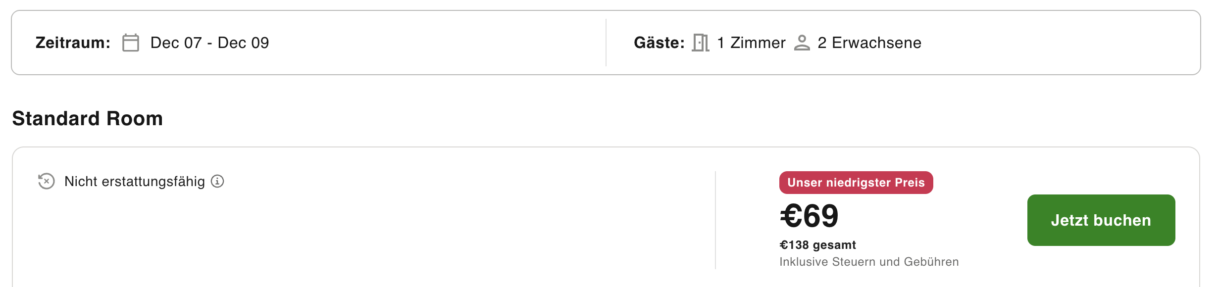 Hier zahlt ihr für die Nacht nur 69€. Lasst euch also einfach direkt dorthin weiterleiten.