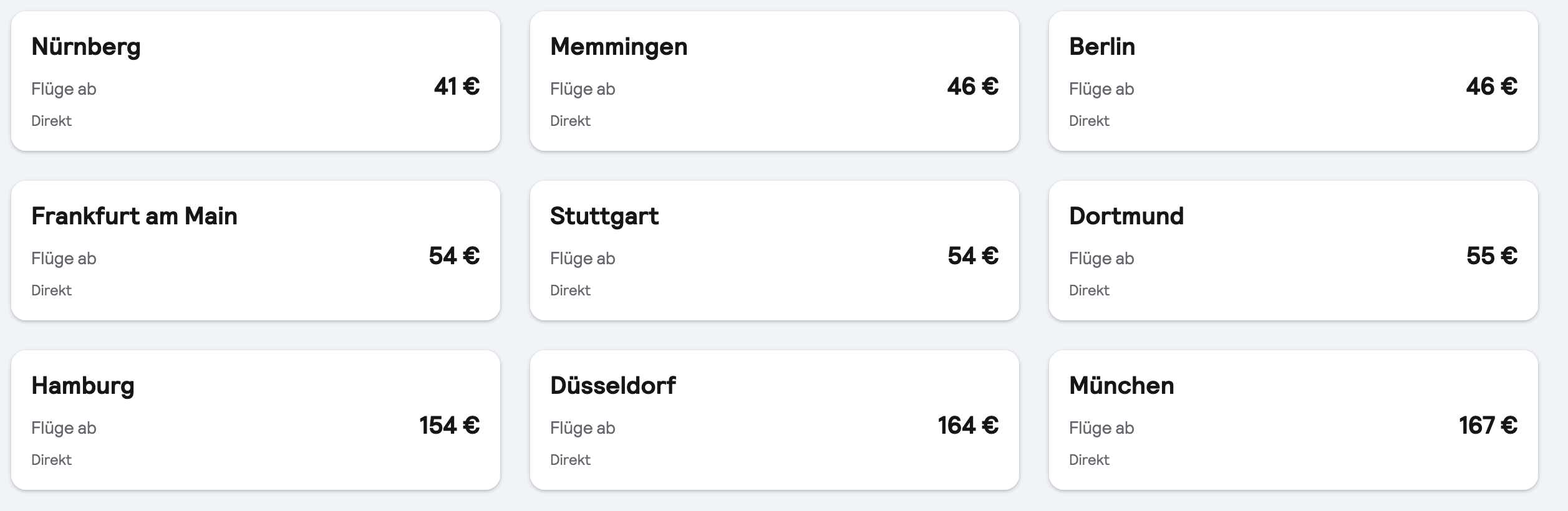 Unten findet ihr die beste Flugoption, die ihr nach Wunsch anpassen könnt – z. B. Abflughafen, Reisedaten oder Personenanzahl. Sobald ihr eure perfekten Flüge gefunden habt, könnt ihr das empfohlene Hotel über den untenstehenden Link passend zu euren Daten buchen. Flug und Hotel werden separat gebucht.