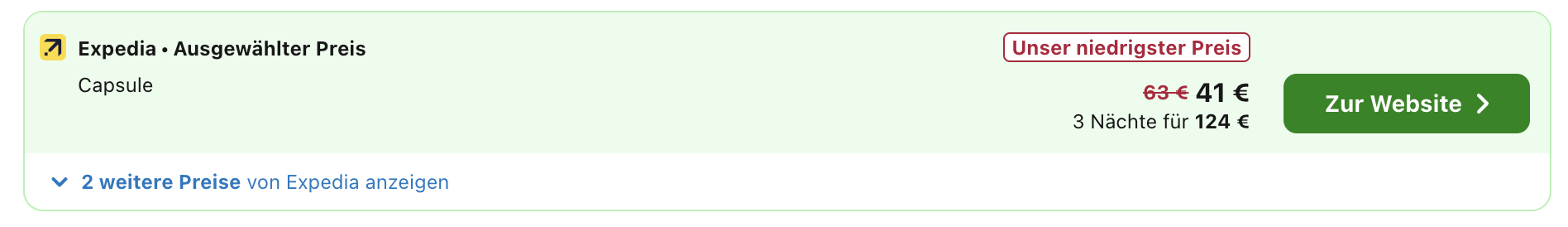 An unserem Beispieltermin konnten wir den besten Preis bei Expedia finden. Klickt bei Trivago also auf "Unser niedrigster Preis" und lasst euch direkt dorthin weiterleiten.