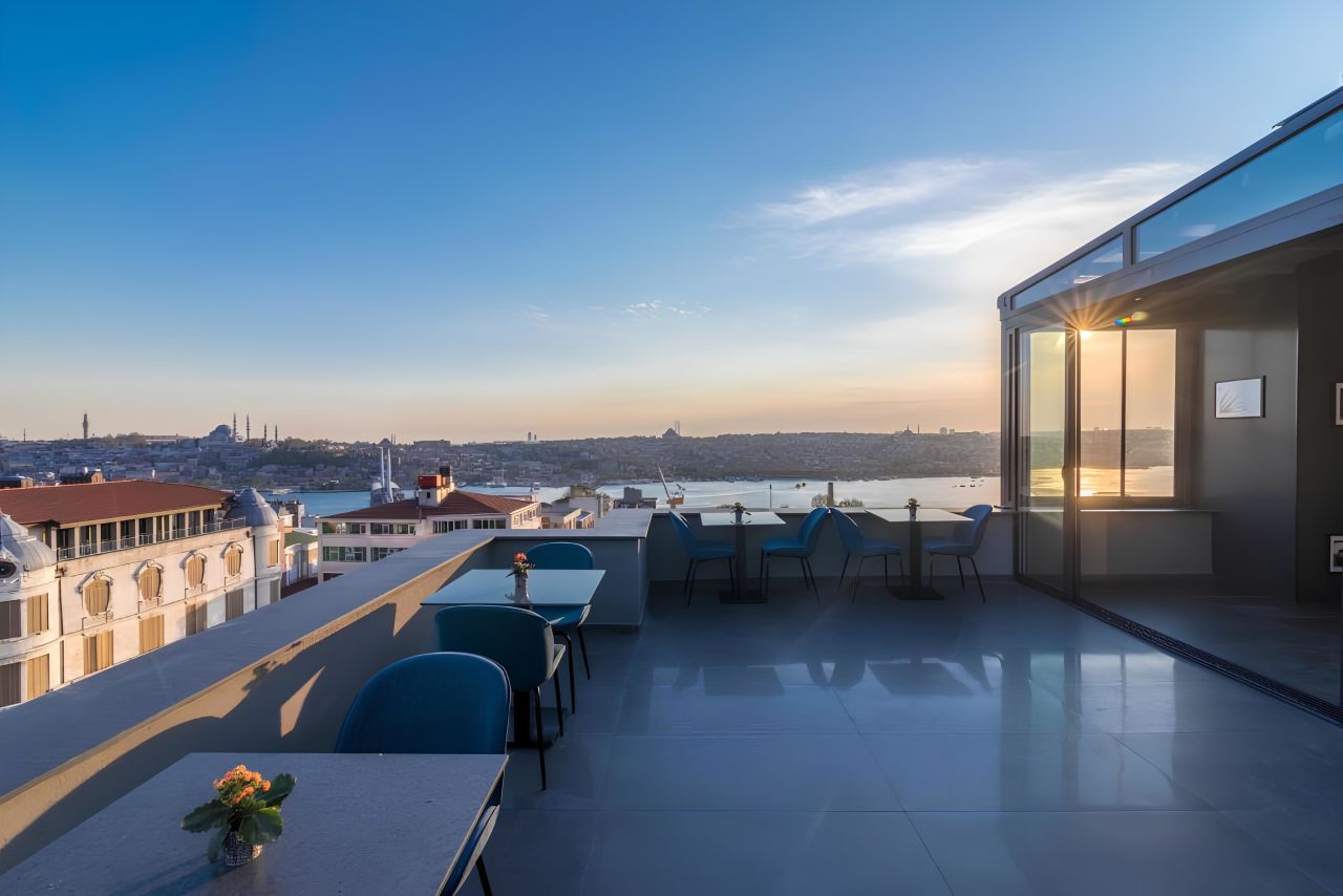 Ach ja und beinah hätten wir's vergessen: Auf dem Dach eures Hotels erwartet euch eine schicke Dachterrasse mit traumhaftem Blick über die Stadt und auf den Bosporus. Hier oben nehmt ihr auch euer Frühstück ein, welches bereits inklusive ist.