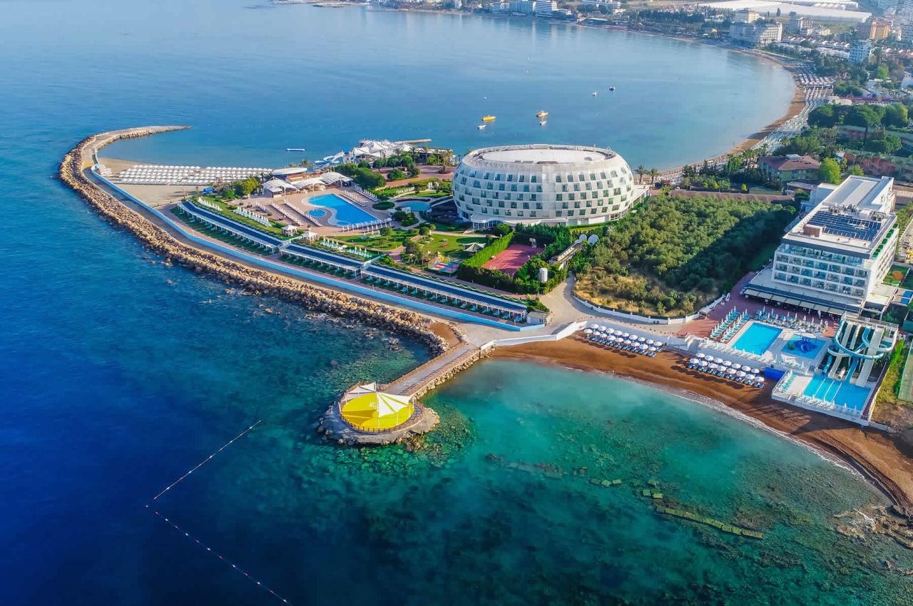 Das Gold Island Hotel ist traumhaft gelegen auf einer Halbinsel und besteht aus 2 großen Gebäuden, darunter das stylische runde Hauptgebäude mit dem unglaublichen 360°-Panoramablick aufs Meer.