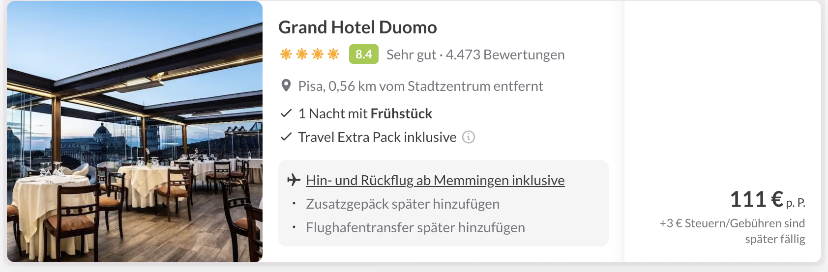 Wie klingt das: 1 Nacht im 4* Grand Hotel Duomo in Pisa inkl. Frühstück und Flügen ab nur 111€ p.P. – dank genialer Flugzeiten habt ihr 2 volle Tage vor Ort, um die Stadt zu entdecken und euch 'ne Pizza in Pisa zu gönnen.