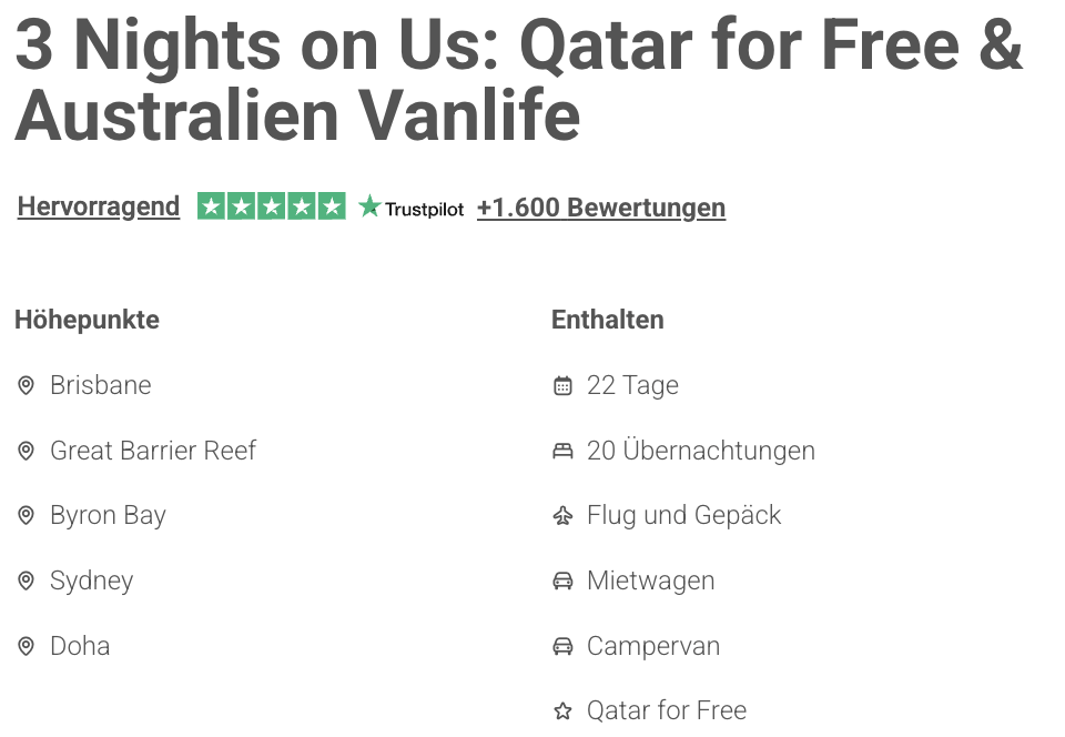 Beispielsweise kannst du u.a. eine 22-tägige Reise nach Australien entlang der Ostküste im Campervan buchen, und das bereits ab 2.799 Euro pro Person, oder aber auch eine 12-tägige Kombireise mit den Highlights Südafrikas & Doha in einem Trip ab nur 1.499€ p.P. verknüpfen. 😮💨