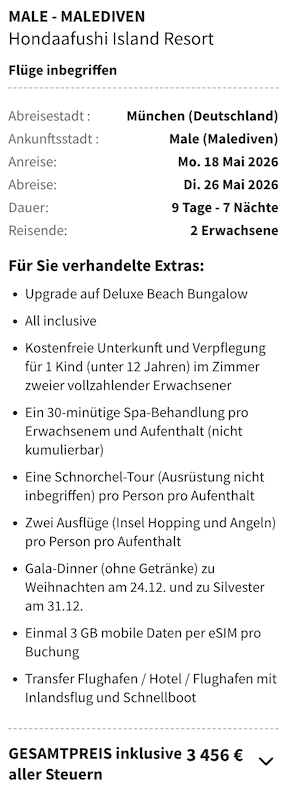 Wir haben wie immer die Preise verglichen und WOW, die Ersparnis ist hier echt enorm! So zahlt ihr bei Schauinsland Reisen (was der günstigste Anbieter ist) insgesamt stolze 4.158€. Bei Voyage Privé hingegen müsst ihr nur 3.456€ auf den Tisch legen. Somit spart ihr mal easy ca. 700€, was 17% entspricht und bekommt sogar noch ein paar Extras on top!!