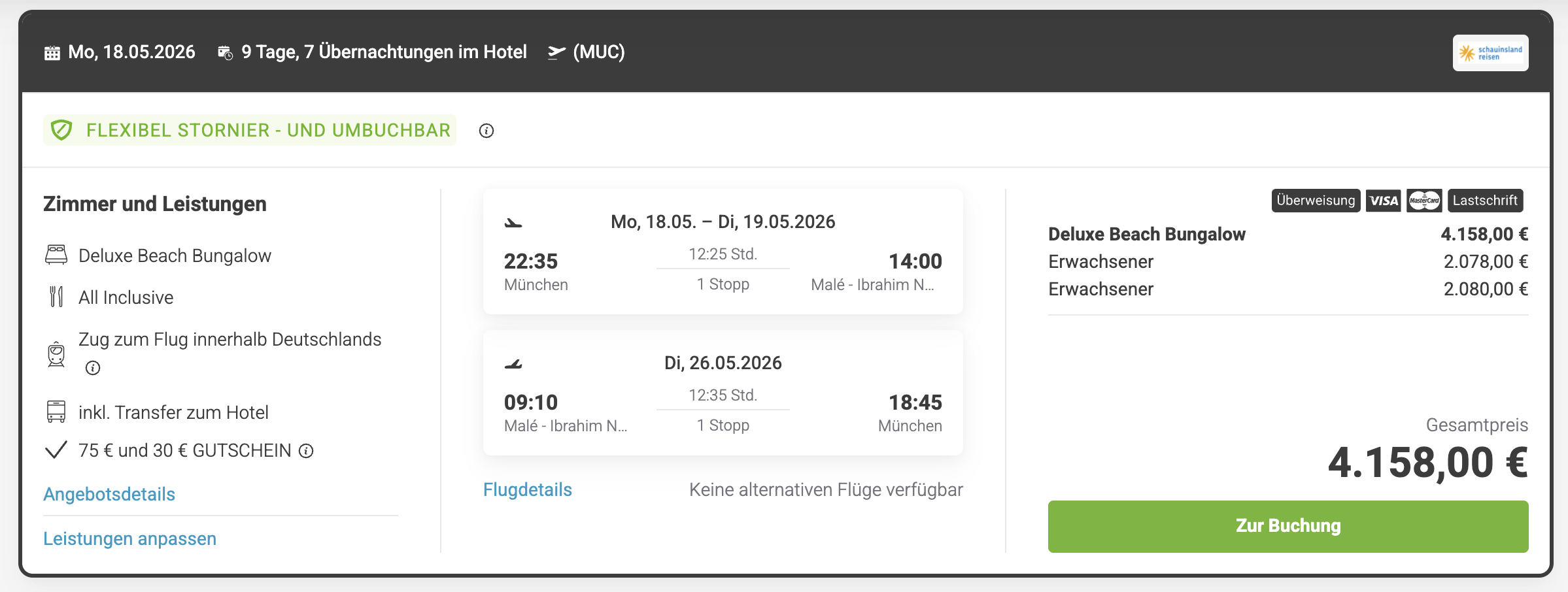 Unterkommen werdet ihr im Deluxe Beach Bungalow – natürlich mit All Inclusive Verpflegung. Außerdem sind die Flüge ab verschiedenen Flughäfen in Deutschland und der private Transfer vor Ort mit dabei. Und obendrauf gibt's noch weitere Extras wie z.B. ein Angel- & Schnorchelausflug.