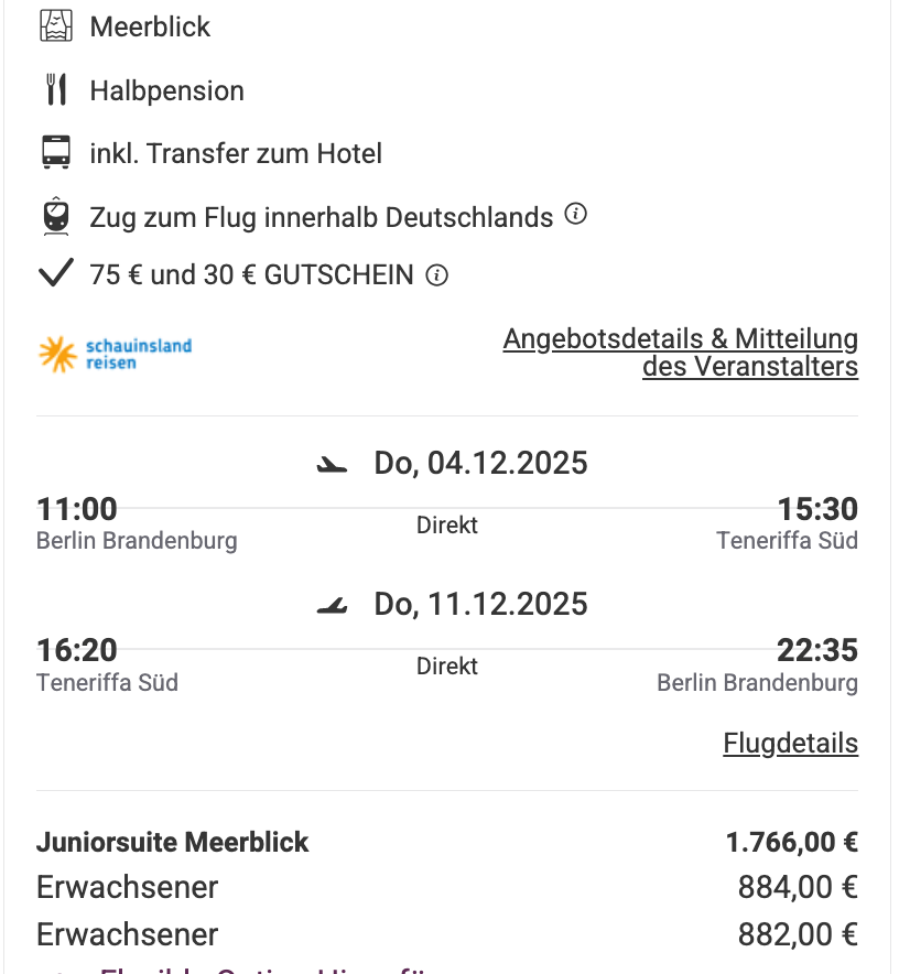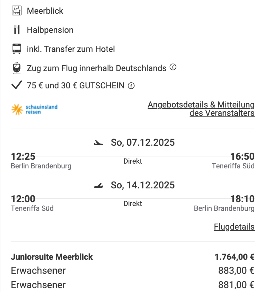Alle hier genannten Reisepreise sind mit der Veröffentlichung des Deals verfügbar und buchbar, jedoch haben wir keinen Einfluss darauf, wann und wie stark sich ein Reisepreis verändern kann. Wenn die Nachfrage besonders hoch ist, kann der Flugpreis sich besonders schnell verändern und Unterkünfte ausgebucht werden.