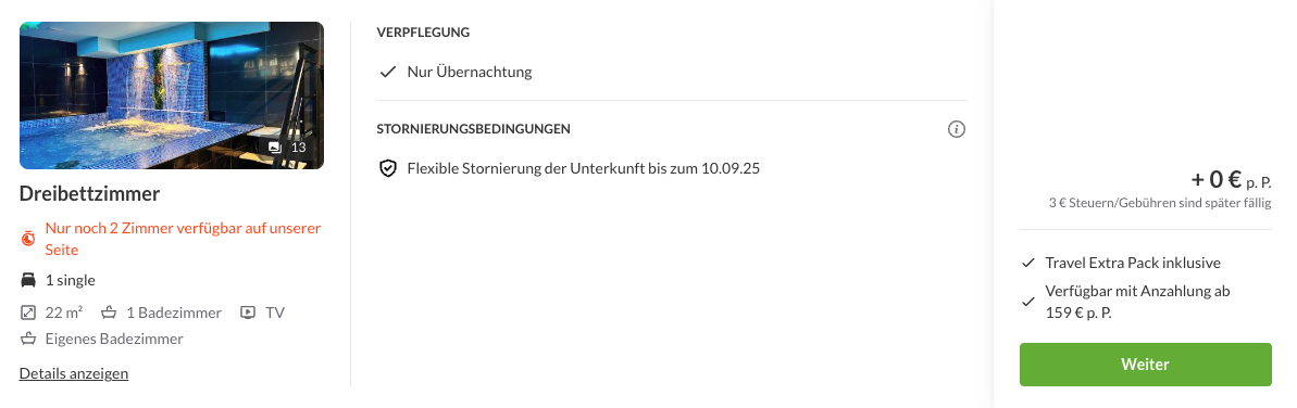 Falls ihr etwas mehr Platz braucht, ein Dreibettzimmer gibt es zum gleichen Preis 😎 (trotzdem nur für 2 Personen, allerdings etwas größeres Hotelzimmer)