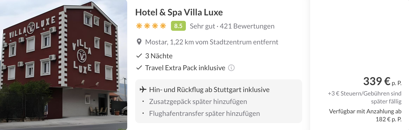 Das 4* Hotel und Spa Villa Luxe hat gute Bewertungen und liegt schön zentral. Zu Fuß braucht ihr zu alten Brücke gerade mal 10 Minuten und seid dann schon mitten im Zentrum. Der Flughafen ist auch nur schnelle 10 Minuten entfernt. Das Hotel bietet ebenfalls einen Pool, denn in Mostar ist es mit bis zu knapp 30 Grad auch im September noch richtig schön warm. Tatsächlich ist Mostar einer der heißesten Städte Europas, im September ist das Wetter dann allerdings ideal!