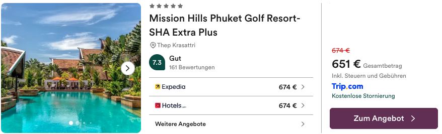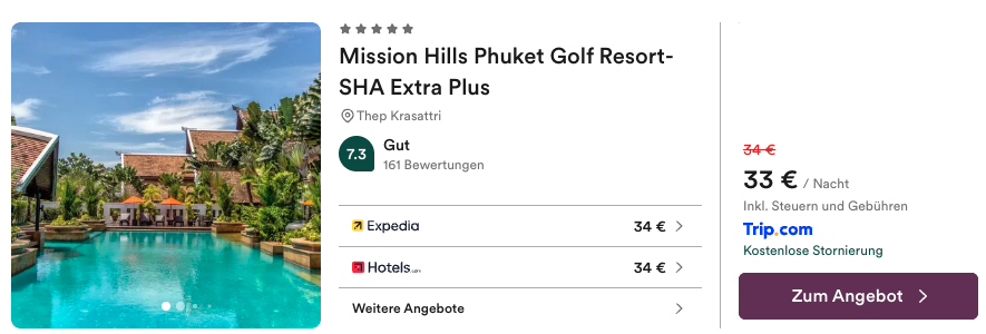 2. Buchungsschritt: HotelZUM HOTELDEALDrei Wochen Sonne, Meer und Ruhe – und das zu einem Preis, der mehr als überrascht: Im eleganten 5-Sterne-Mission Hills Phuket Golf Resort (SHA Extra Plus) verbringt ihr fast 3 Wochen auf Thailands Trauminsel, inklusive Hin- und Rückflug, schon ab 830,50 € pro Person. Perfekt für alle, die dem Herbst bzw. Winter entfliehen und sich eine stilvolle Auszeit mit Komfort, tropischem Flair und erstklassigem Service gönnen möchten.