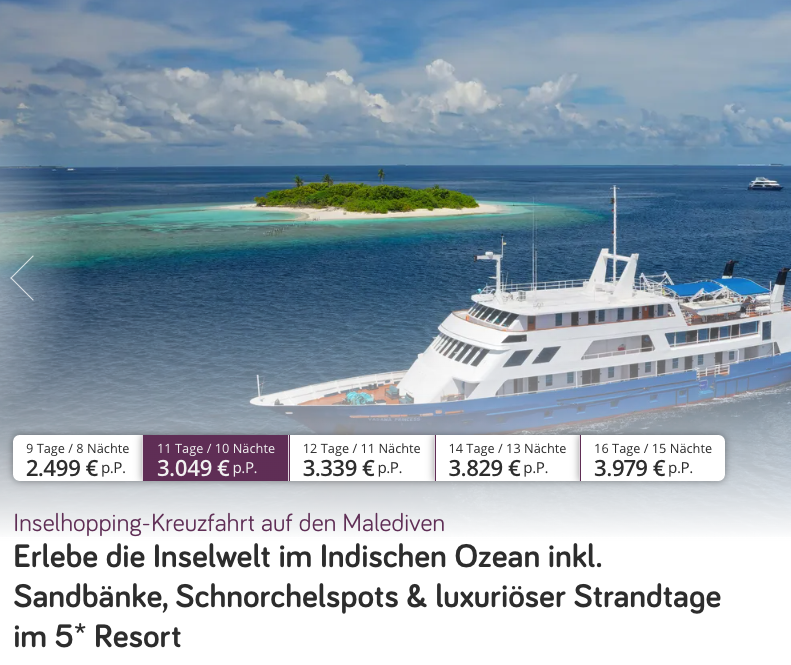 Diese Reise gibt es in verschiedenen Reiselängen. Ihr könnt zum Beispiel auch nur die 7-Nächtige Kreuzfahrt machen ohne Hotelaufenthalt im Anschluss, diese Variante gibt es bereits ab 2.499€ 2.449€ pro Person.