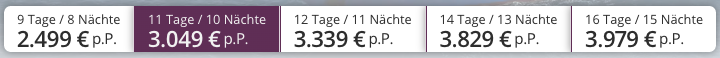 * der Aufenthalt vor Ort ist jeweils um eine Nacht verkürzt, da der Übernachtflug auf dem Hinweg mit in die Reisedauer einberechnet ist. Heißt, bei 8 Nächten habt ihr 7 Nächte vor Ort, bei 10 Nächten habt ihr 9 Nächte vor Ort etc.