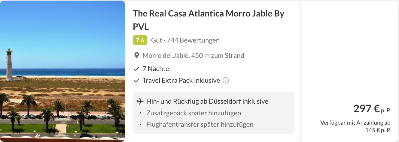 In diesem Deal zeigen wir euch, wie ihr in den Wintermonaten November & Dezember auf die immerwarme Insel Fuerteventura reisen könnt - 7 Nächte inkl. Flügen, 1x 20 kg Gepäck, Unterkunft sowie Mietwagen - beispielsweise in Morro del Jable (einem Örtchen im Süden der Insel, am Meer mit Einkaufs- und Ausgehmöglichkeiten sowie mehreren Stränden in Laufumgebung).