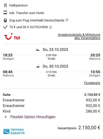In diesem Beispiel verbringt ihr als Familie (Beispiel mit 2 Erwachsenen und 1 Kind bis 12J.) eine Woche auf Mallorca. ☀️ Untergebracht seid ihr dabei im nach Renovierung erst in diesem Jahr wiedereröffneten 4* Inturotel Esmeralda Park in Cala d'Or. Inklusive der täglichen Halbpension 🥘, Transfer und Flügen zahlt ihr insgesamt weniger als 2.200€. Richtig cool: Als Familie übernachtet ihr in der Suite! ✨