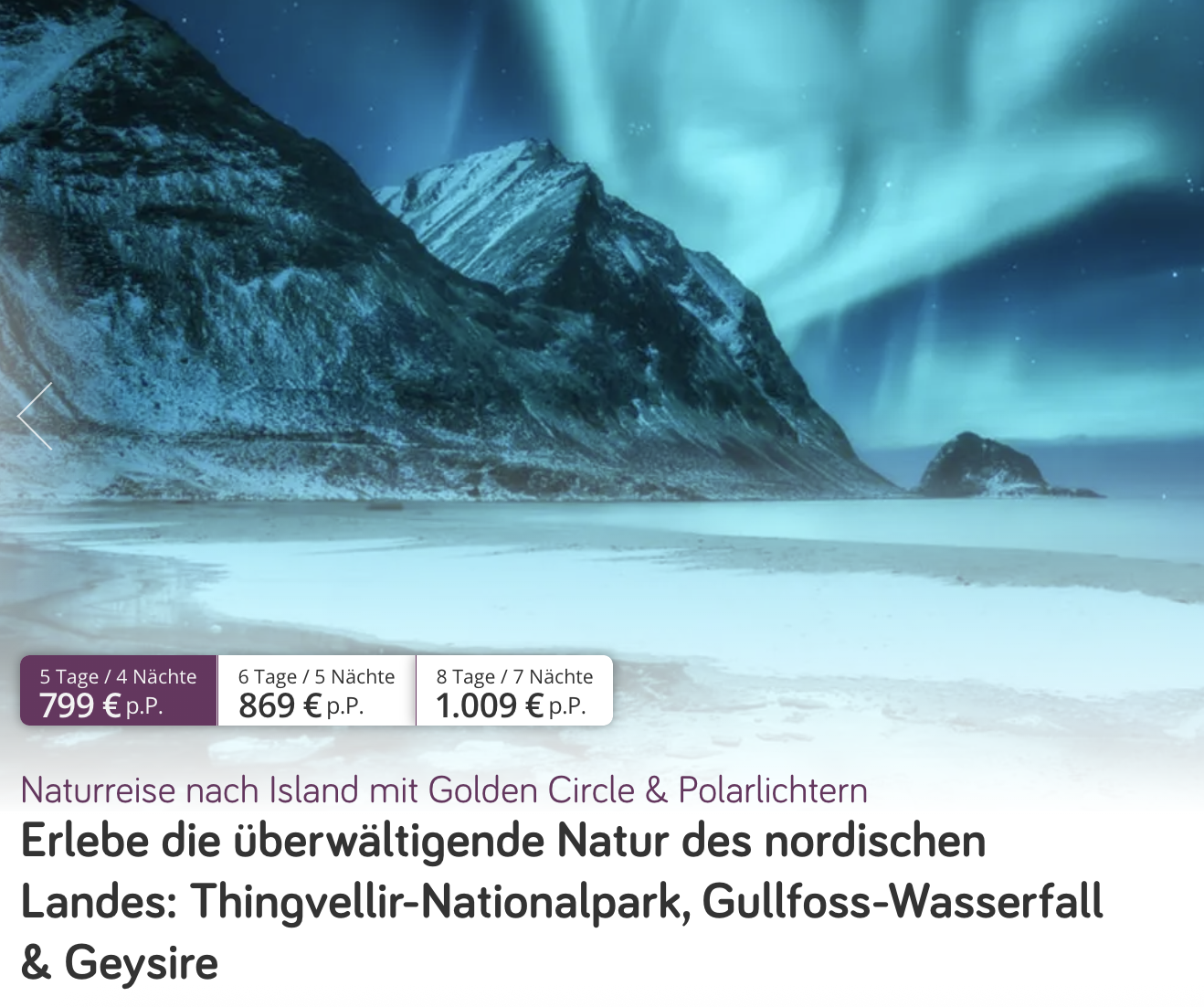 Fliegt für 5 Tage (4 Nächte vor Ort) in den einsamen Norden und überzeugt euch höchstpersönlich. Ab 769€ pro Person bekommt ihr ein Gesamtpaket mit Flügen, Unterkunft, Frühstück, Transfer, eine Ganztages-Golden-Circle-Tour, die euch zu den schönsten und bekanntesten Ecken Islands bringt, sowie eine Polarlichter-Tour ❤️