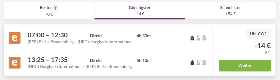 Nach Weiterleitung könnt ihr den Abflughafen, die Flugzeiten und das Datum nach euren Wünschen anpassen.