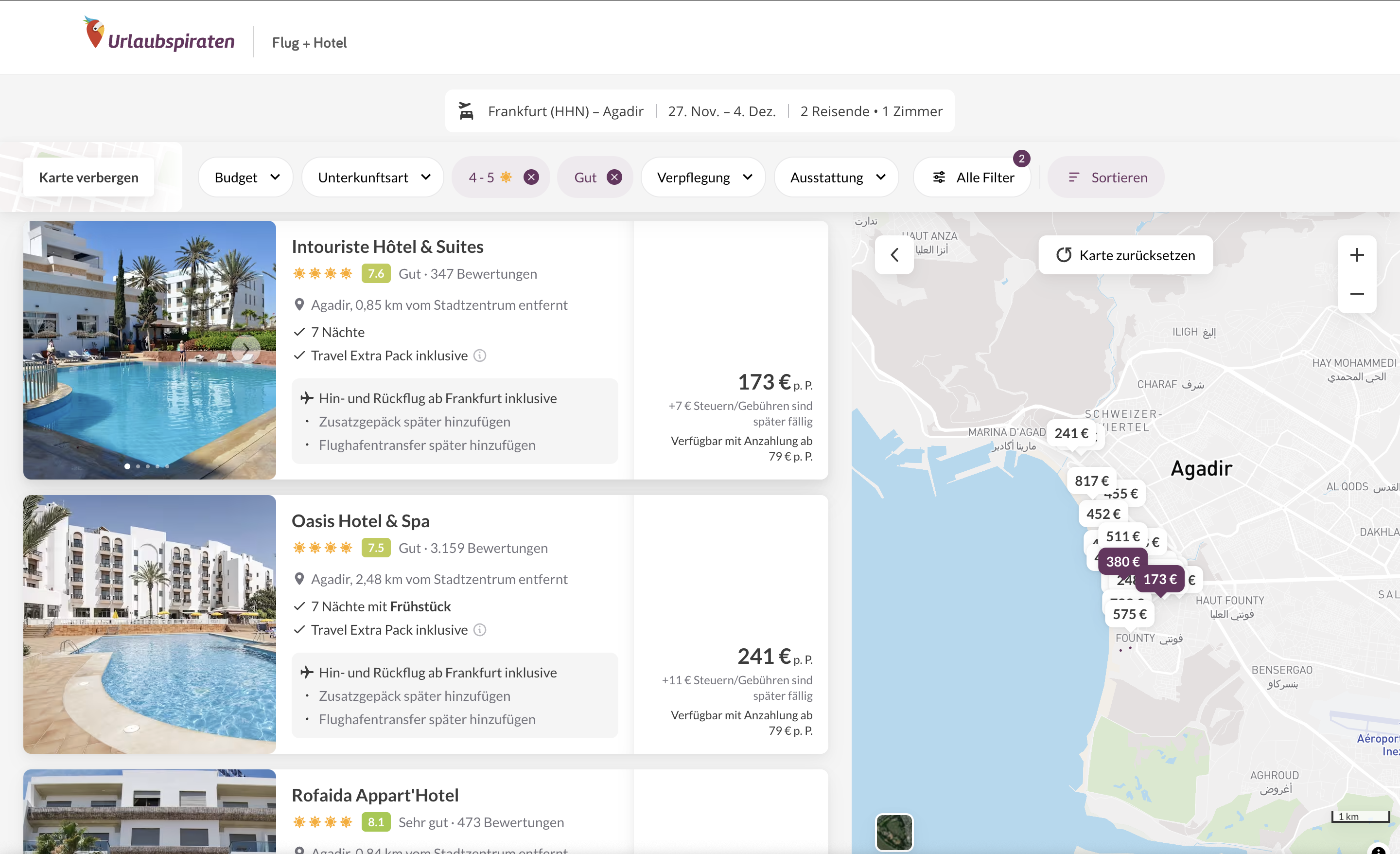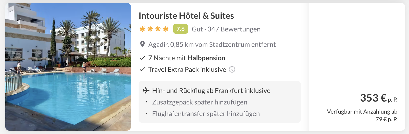 ℹ️ Das ist nur eine von vielen Unterkünfte, die euch in der Reisesuche angezeigt werden. Wir haben hier für euch schon mal gute 4-5* Hotels am Strand von Agadir vorgefiltert. Ihr könnt die Suche aber nach der Weiterleitung einfach auch nach euren Wünschen anpassen.