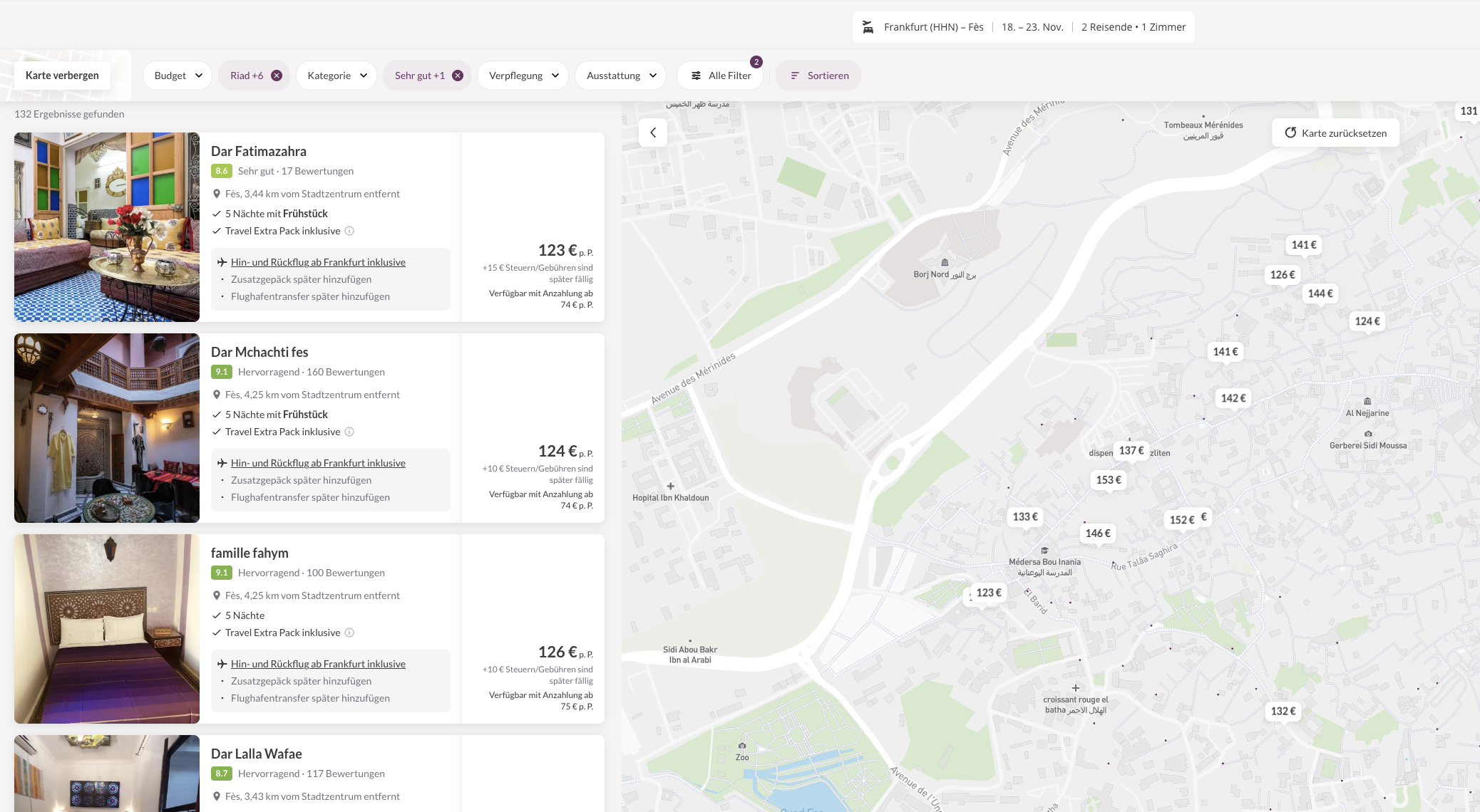 Wie ihr seht, starten die Preise hier schon bei unter 100€ pro Person für die 5 Nächte inkl. Flug. Wir haben euch top bewertete, zentrale Unterkünfte vorgefiltert, meist Riads, mit privatem Bad. Ihr könnt aber auch zB. nach Hotels suchen.