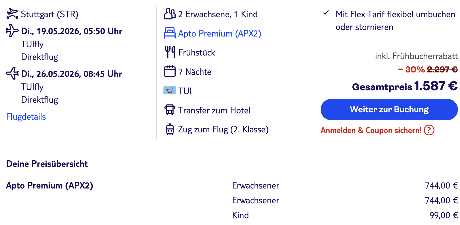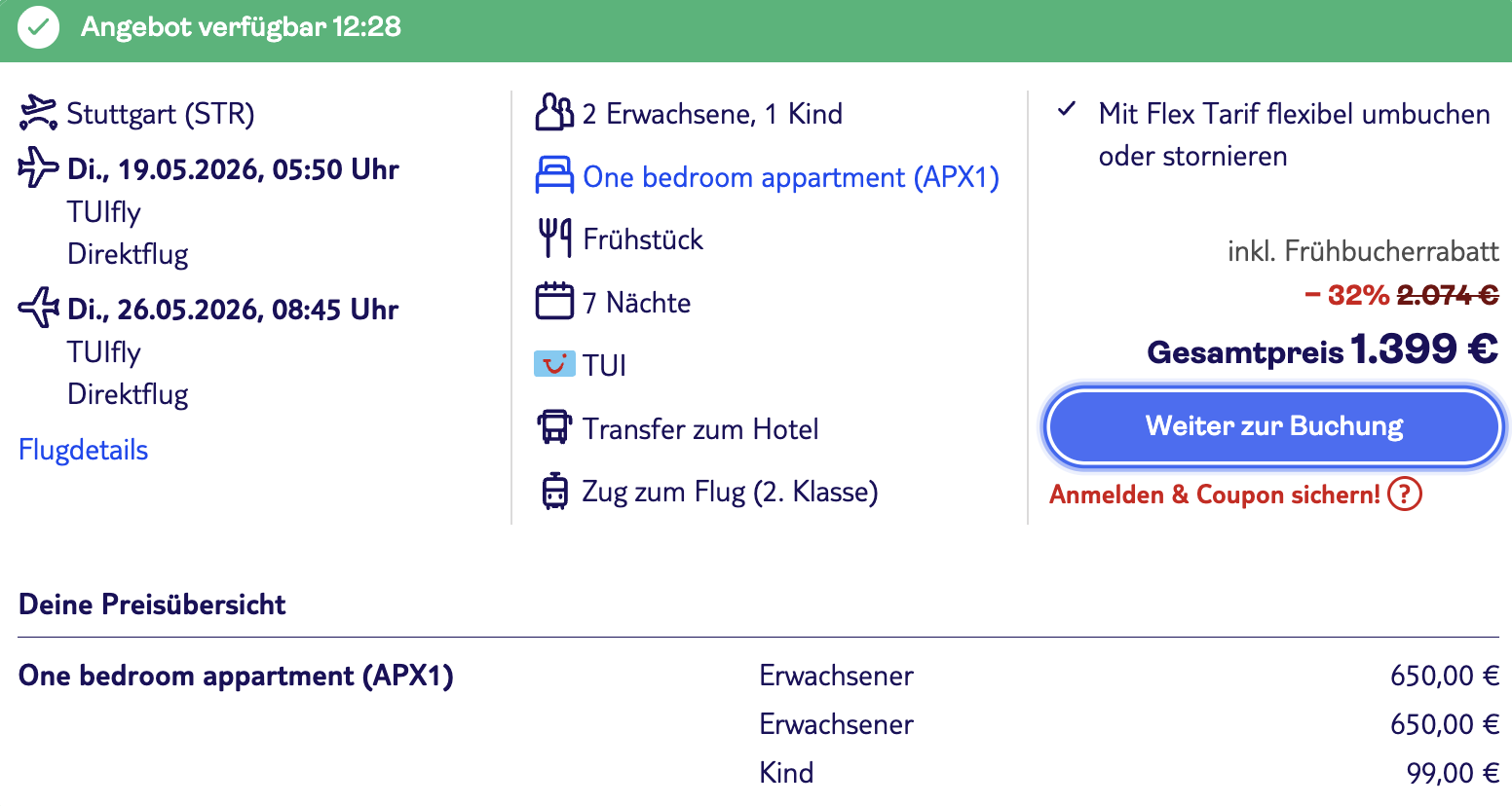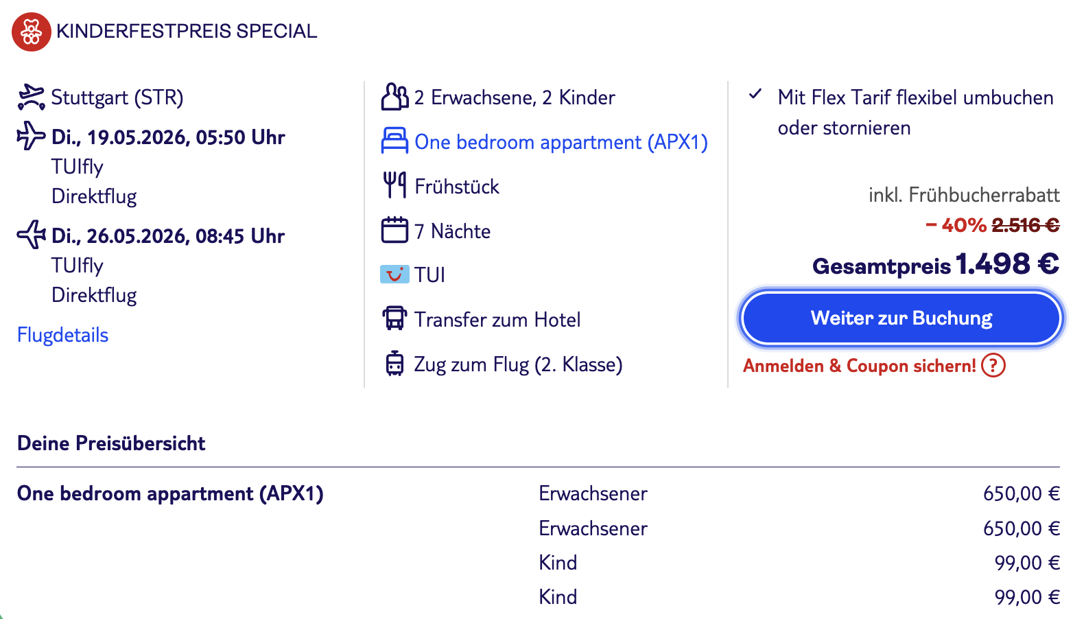 Für ein Apartment mit 2 Schlafzimmern zahlt ihr nur einen kleinen Aufpreis. Zudem könnt ihr auch Halbpension oder All Inclusive buchen. Der Festpreis pro Kind bleibt aber bei 99€!!! Weiter unten haben wir euch verschiedene Optionen verlinkt.👇 Die Aktion mit allen Hotels Angeboten findet ihr 👉hier.