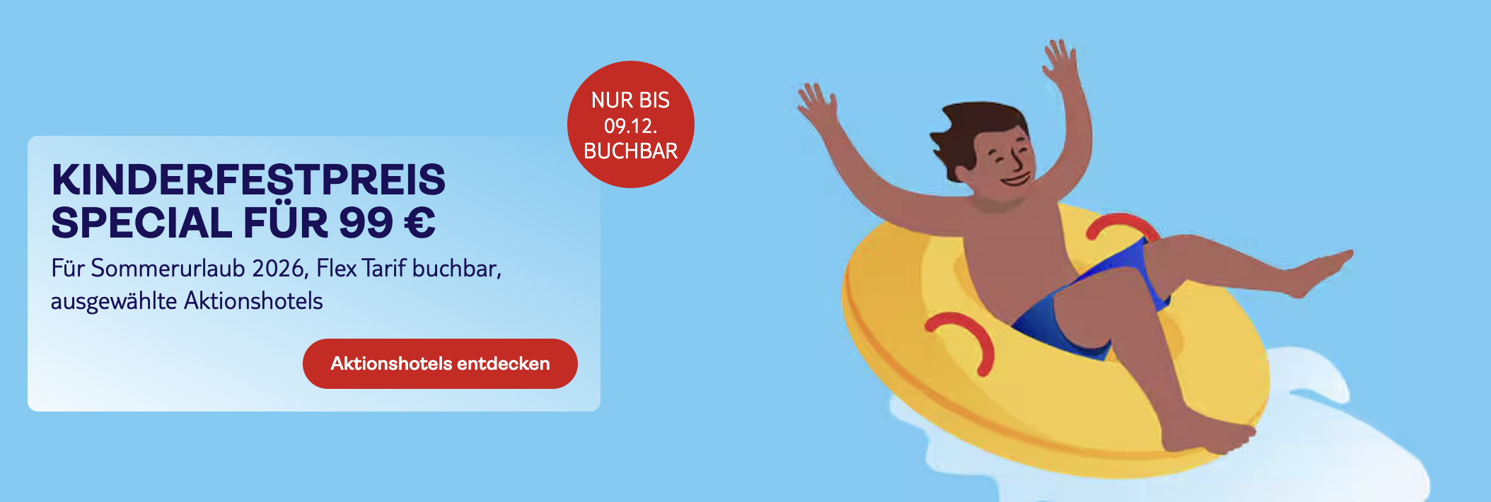 Alle Angebote10 traumhafte Familienhotels in Spanien, Griechenland, Türkei und Bulgarien zum Knallerpreis gibt es nur bei TUI bis zum 09. Dezember.⏰ Kinder von 2 bis 12 Jahren reisen in ausgewählten Zeiträumen für nur 99€ in den Sommerurlaub 2026. 🥳