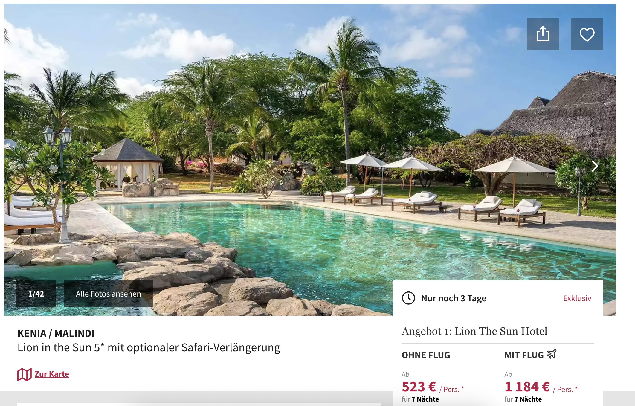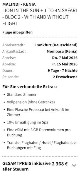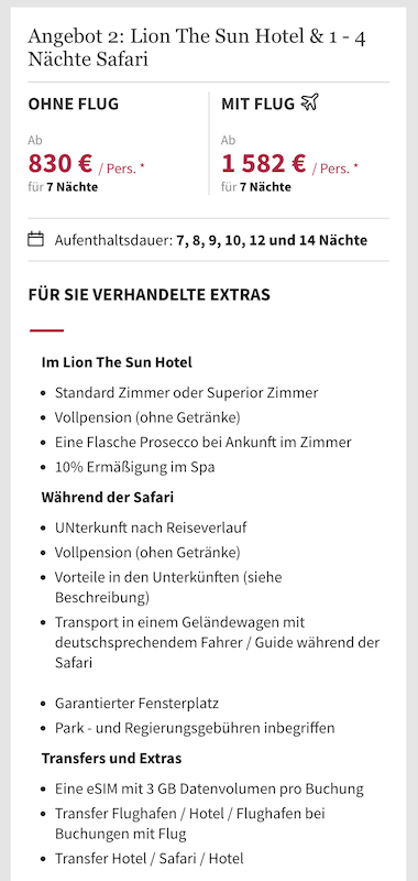 Wer Lust hat, kann auch direkt die Safari-Option mit dazu buchen, hier starten die Preise dann bei 1.582€ pro Person.