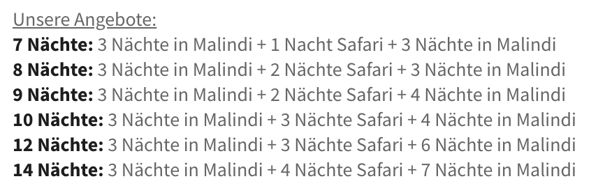 Malindi selbst ist ein faszinierender Mix aus afrikanischer Lebensfreude, arabischem Einfluss und italienischem Flair – perfekt für alle, die Sonne, Kultur und Natur lieben. Egal ob last minute oder für die kommende Saison: Dieser Trip vereint Luxus, Abenteuer und pure Entspannung in einer einmaligen Kombination.