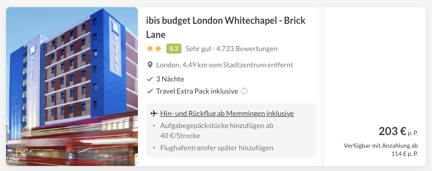 Einige (preiswerte) Hotels in London bieten Zimmer mit Gemeinschaftsbadezimmern an; jene kann man leider nicht rausfiltern; achtet bitte bei der Hotel- und Zimmerauswahl drauf. Das Hotel aus dem Preisbeispiel hat ein Zimmer mit Privatbad.