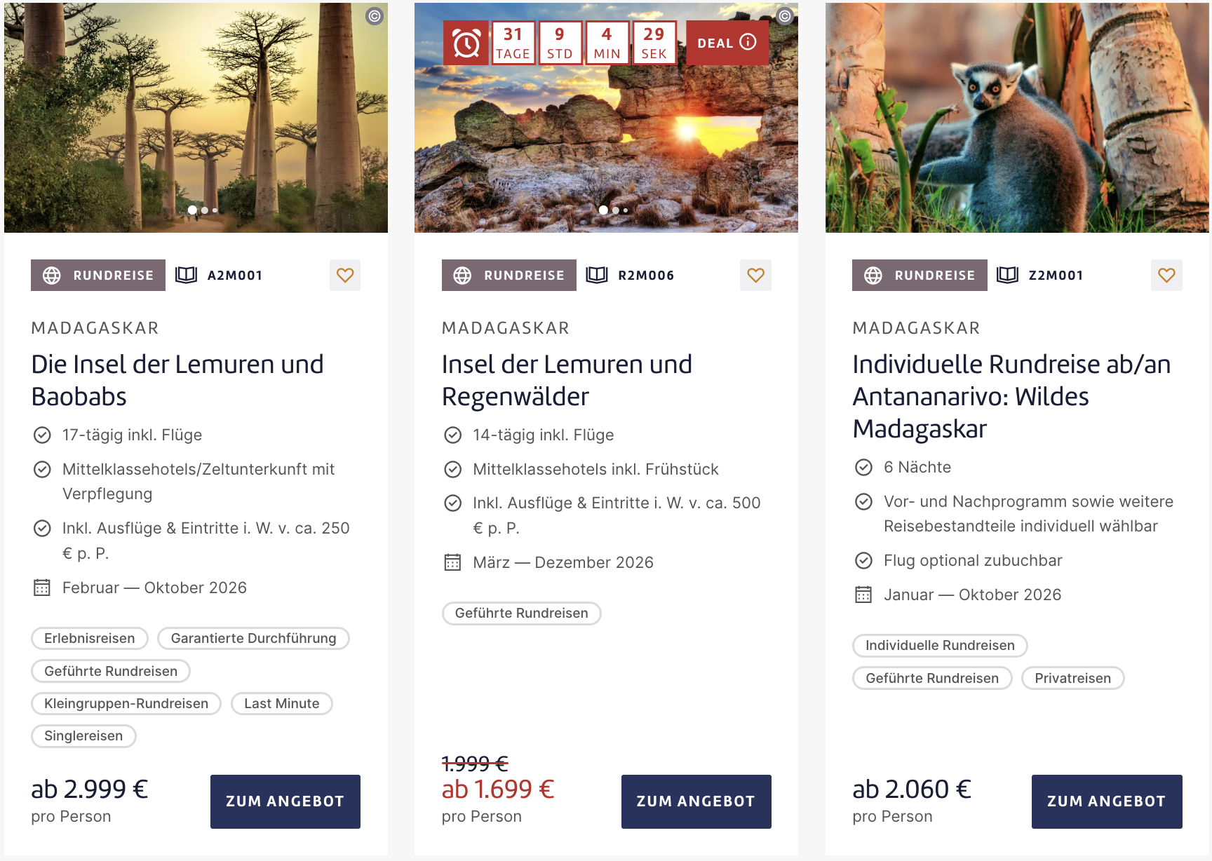 So fliegt ihr z.B. bereits ab 1.699€ p.P. für 14 Tage nach Madagaskar, übernachtet in verschiedenen Hotels entlang der vorgeplanten Route und dürft euch auf ein abwechslungsreiches Programm mit insgesamt 13 spannenden Highlights freuen!