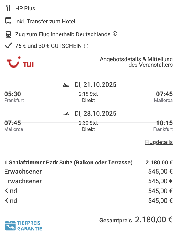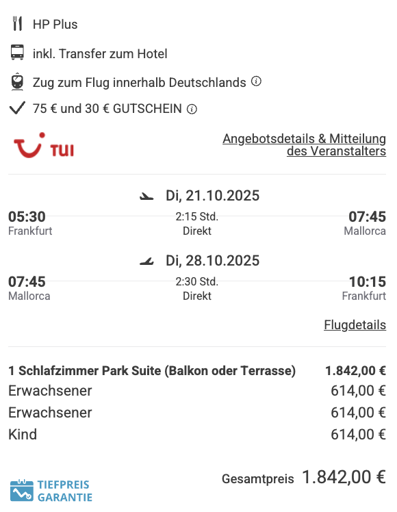Hört sich traumhaft an, oder? Und das zu diesem unglaublichen Preis – 1 Woche in der Suite mit separaten Schlafzimmer inklusive Halbpension Plus (Getränke zum Essen), Direktflug, Transfer, Rail&Fly kostet euch für 2 Erw.+Kind (12J.) ab nur 1842€. Mit zwei Kindern zahlt ihr insgesamt ab nur 2216€. 🥳