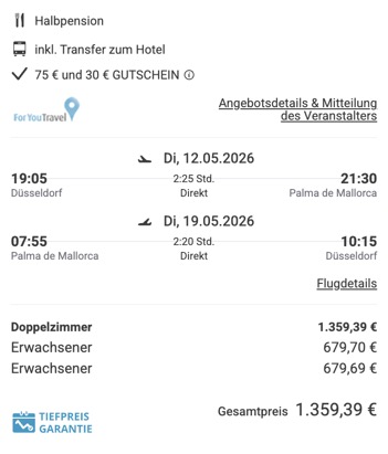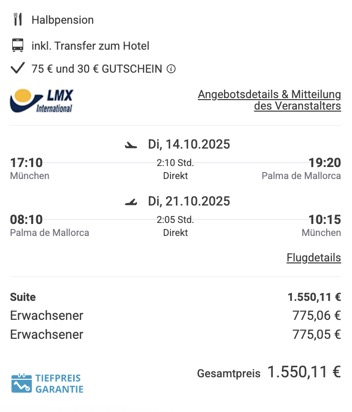 Alle hier genannten Reisepreise sind mit der Veröffentlichung des Deals verfügbar und buchbar, jedoch haben wir keinen Einfluss darauf, wann und wie stark sich ein Reisepreis verändern kann. Wenn die Nachfrage besonders hoch ist, kann der Flugpreis sich besonders schnell verändern und Unterkünfte ausgebucht werden.