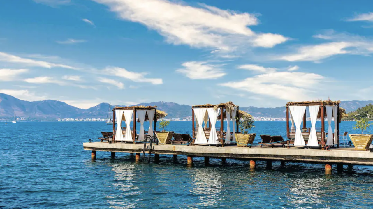 Das Marmaris Bay Resort befindet sich direkt am Meer und verfügt auch über einen Sand-/Kiesstrand mit Liegen. Außerdem gibt es zwei Außenpools und eine Sonnenterrasse. Neben 3 Restaurants (à la carte-Restaurants 1x wöchentlich ohne Aufpreis nutzbar) warten auch 6 Bars auf euch, alkoholfreie Getränke gibt es rund um die Uhr und alkoholische Getränke bekommt ihr zwischen 10 und 24 Uhr.