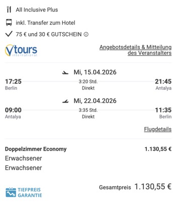 Alle hier genannten Reisepreise sind mit der Veröffentlichung des Deals verfügbar und buchbar, jedoch haben wir keinen Einfluss darauf, wann und wie stark sich ein Reisepreis verändern kann. Wenn die Nachfrage besonders hoch ist, kann der Flugpreis sich besonders schnell verändern und Unterkünfte ausgebucht werden.