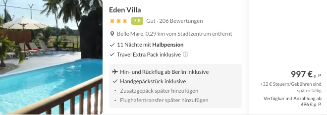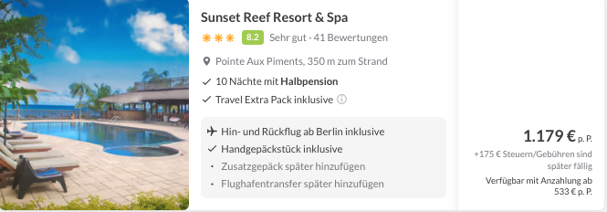 z.B. geht es ab/bis Berlin im Dezember für 11 Nächte / 13 Reisetage auf die Insel inkl. Flügen und einem Hotel (unweit vom Strand) mit Pool und Halbpension und das ab 997 Euro pro Nase! ✈️ 🏃♂️ Wir haben auch Angebote für Singles & Familien hinterlegt.