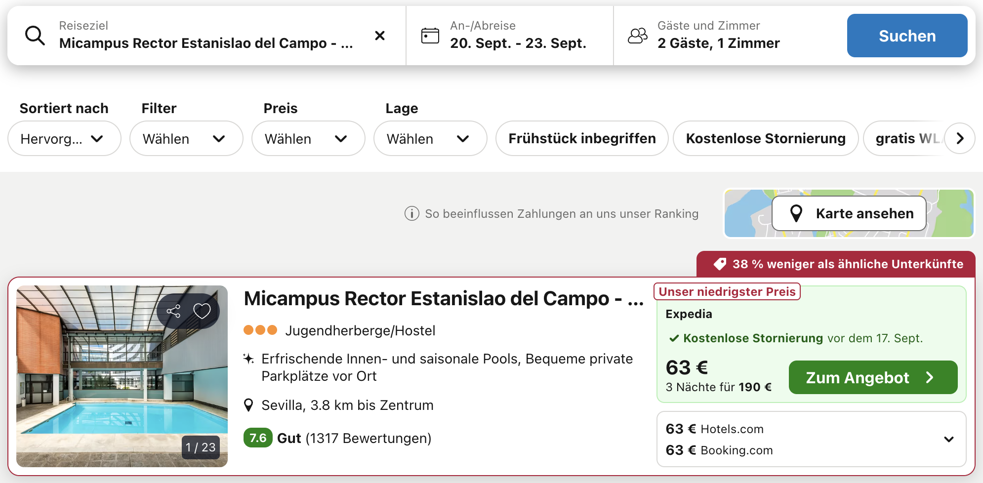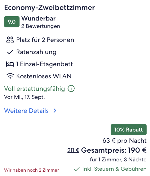 An unsrem Beispieltermin konnten wir den günstigsten Preis unter anderem bei Expedia finden. Hier zahlt ihr für die Nacht nur 63€ und somit für 3 Nächte 95€ pro Person.