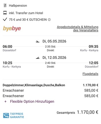 Alle hier genannten Reisepreise sind mit der Veröffentlichung des Deals verfügbar und buchbar, jedoch haben wir keinen Einfluss darauf, wann und wie stark sich ein Reisepreis verändern kann. Wenn die Nachfrage besonders hoch ist, kann der Flugpreis sich besonders schnell verändern und Unterkünfte ausgebucht werden.