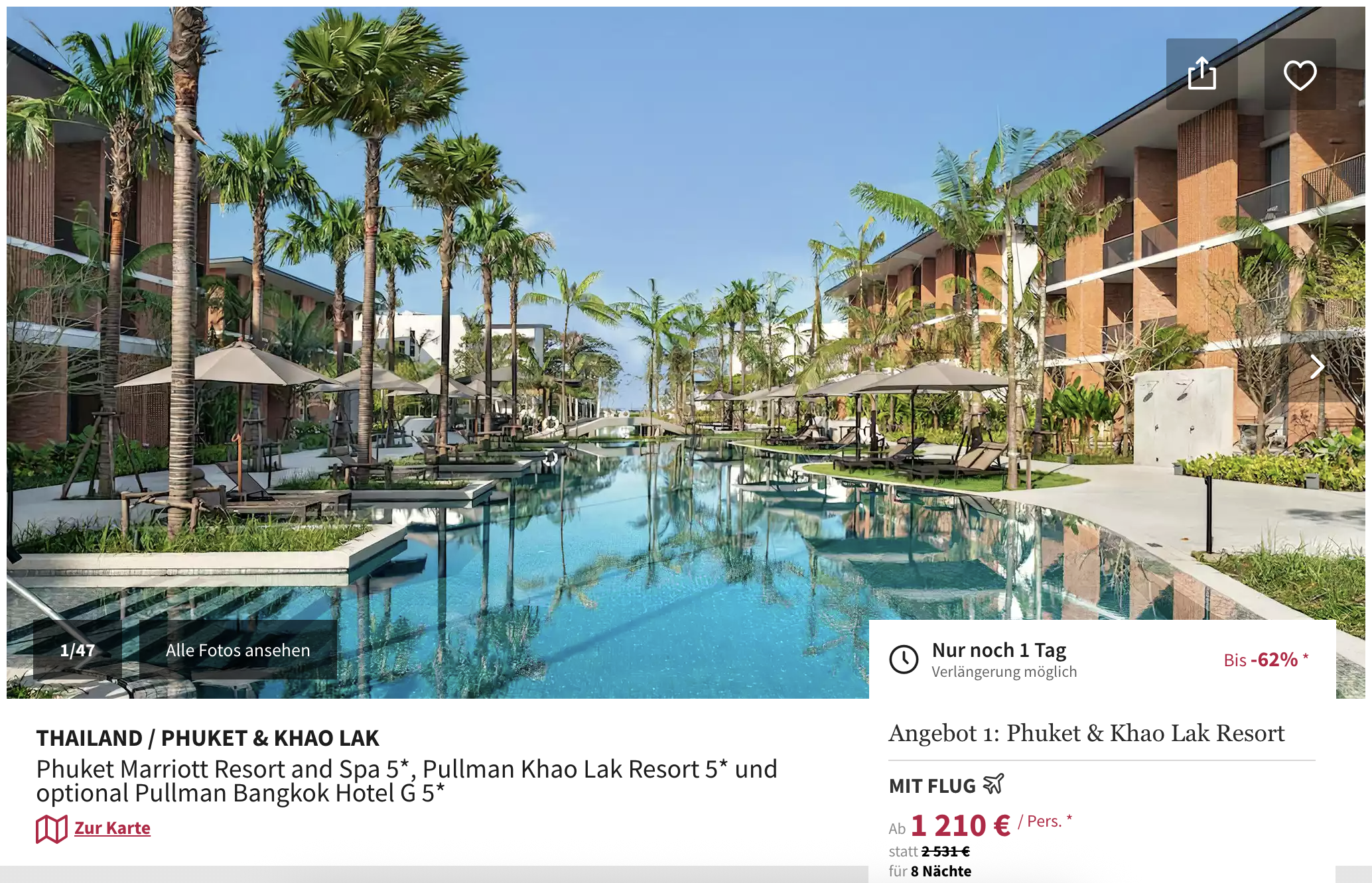 Euer erster Stopp führt euch ins 5* Phuket Marriott Resort & Spa, wo türkisblaues Wasser, palmengesäumte Strände und edles Ambiente auf euch warten. Genießt die Ruhe, lasst euch im Spa verwöhnen oder startet den Tag mit einem Frühstück mit Meerblick.