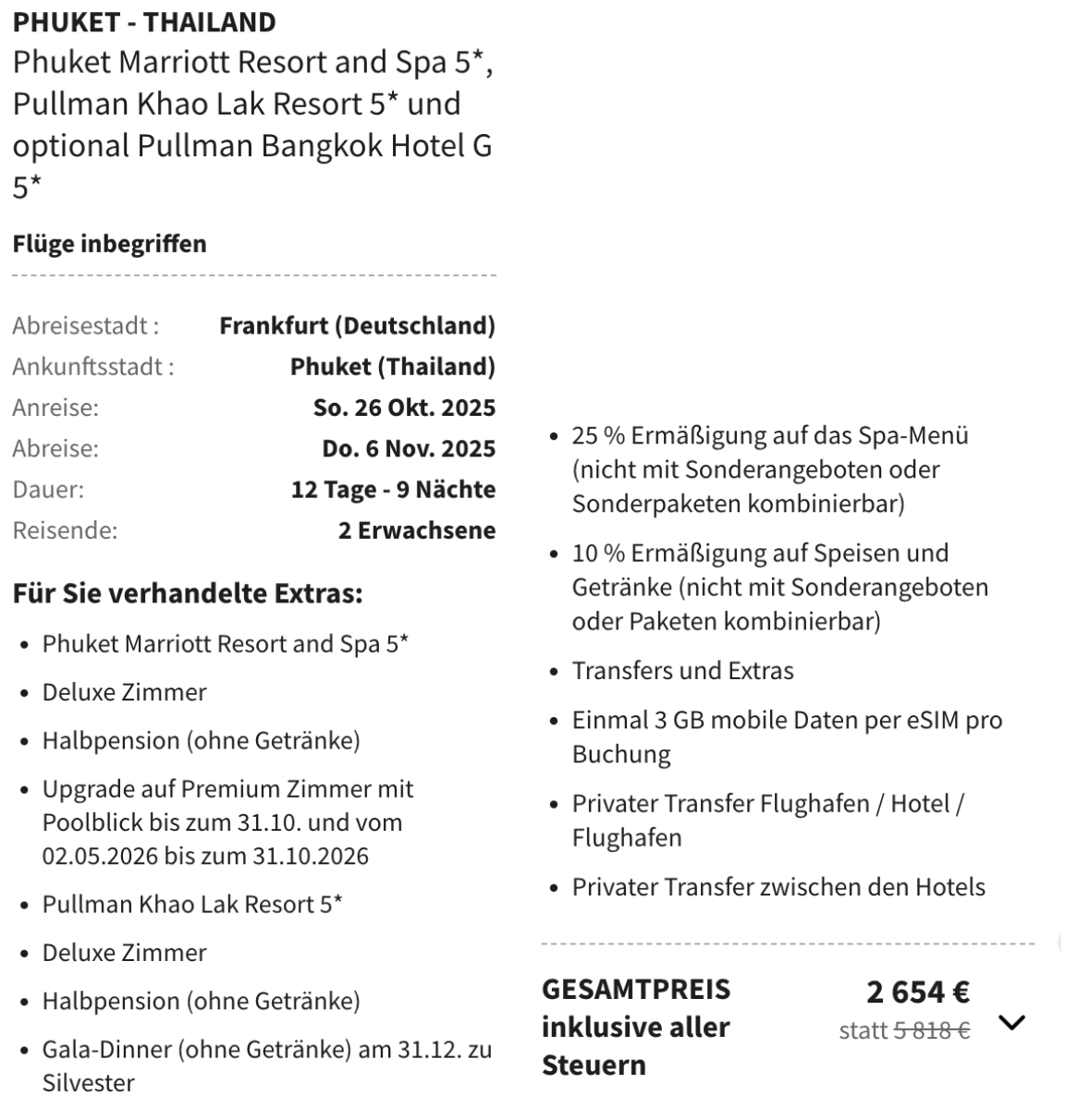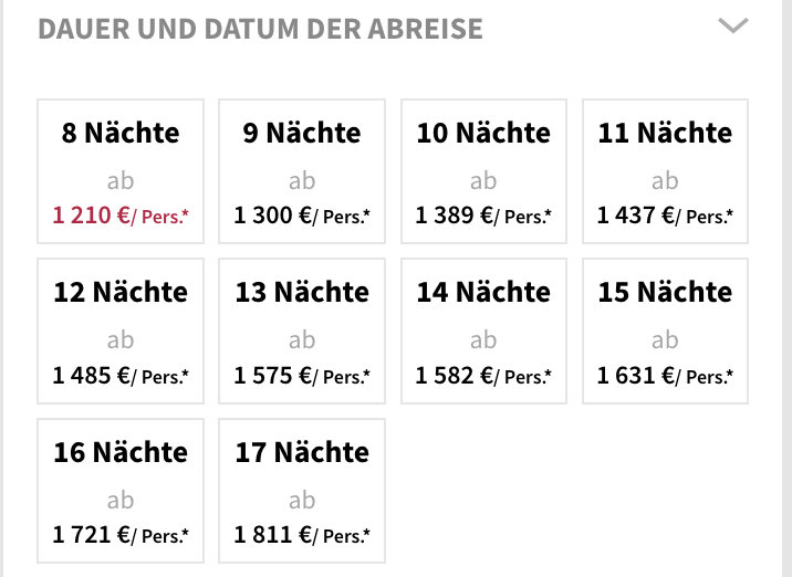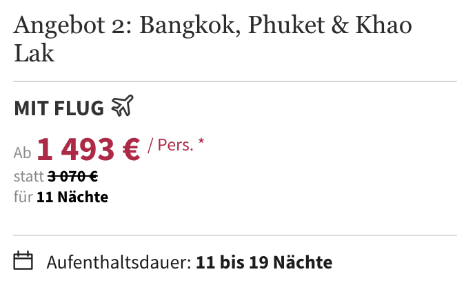 Wer mag, kann auch Bangkok als Destination mit reinnehmen und dort ein paar Tage verbringen. Hier starten die Preise bei 11 Nächten dann bei 1.493€. Scrollt nach der Weiterleitung einfach weiter nach unten, um das Angebot 2 zu buchen.