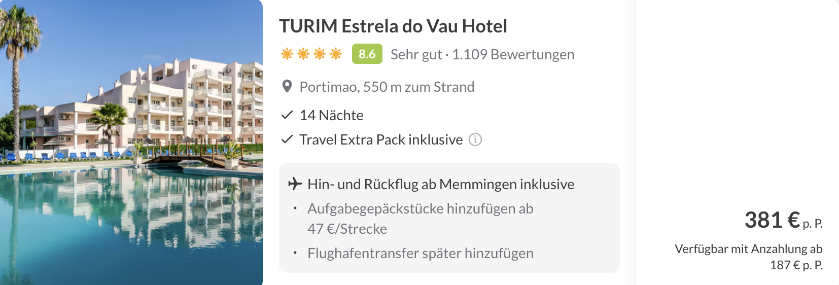 heute haben wir einen richtigen Kracher für euch! Es geht z.B. im Mai zur Vorsaison nach Portimao an die Algarve! Im Mai könnt ihr schon mit bis zu über 22 Grad rechnen! Für 2 Wochen inkl. Flügen in einem 4* Hotel inkl. Balkon, Pool und vieles mehr zahlt ihr einfach mal nur 381 € p.P. 😎