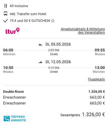 Alle hier genannten Reisepreise sind mit der Veröffentlichung des Deals verfügbar und buchbar, jedoch haben wir keinen Einfluss darauf, wann und wie stark sich ein Reisepreis verändern kann. Wenn die Nachfrage besonders hoch ist, kann der Flugpreis sich besonders schnell verändern und Unterkünfte ausgebucht werden.