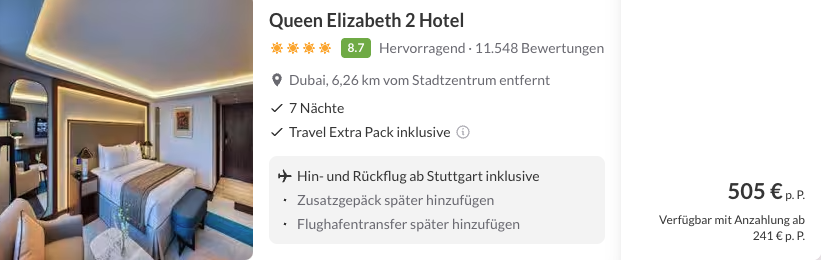 wir haben gerade ein richtig cooles Hotel entdeckt. Und zwar könnt ihr jetzt in Dubai auf einem 4* Hotelschiff übernachten! Die Queen Elizabeth 2 liegt seit 2018 im Hafen von Dubai. Für 7 Nächte inkl. Direktflügen zahlt ihr somit gerade mal 505 € p.P zur besten Reisezeit. 😎 Für 44 € Aufpreis gibt es auch Frühstück für die ganze Woche dazu (p.P.)