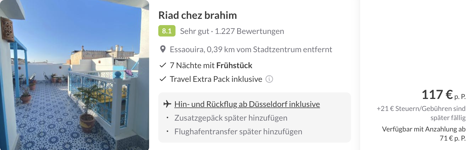 Falls euch höhere Preise angezeigt werden: Teilweise wählt lastminute nicht direkt die richtigen Flüge aus. Lasst euch einfach kurz weiterleiten und achtet bei der Flugauswahl auf den richtigen Flughafen Essaouira (ESU). Teilweise sind Marrakesch oder Agadir vorausgewählt, zu einem höheren Preis!