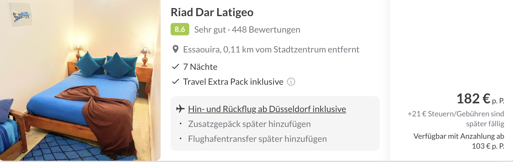 Wir halten es kurz: 7 Nächte im Hotel (traditionelles Riad) in Essaouira inkl. Flügen im November bekommt ihr bereits ab 182 € p.P. Im November hat es in Essaouira noch bis zu 22 Grad 😍☀️.