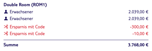Gebe nacheinander den dort hinterlegten 300 Euro & 10 Euro Gutscheincode in der Buchungsmaske ein