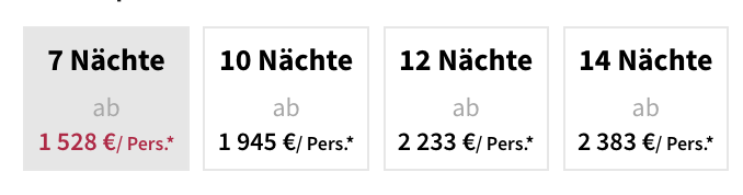 Beachtet bitte auch, dass Voyage Privé eine Buchungsgebühr von 15€ erhebt, diese ist jedoch bereits hier in unsrem Beispiel mit eingerechnet.