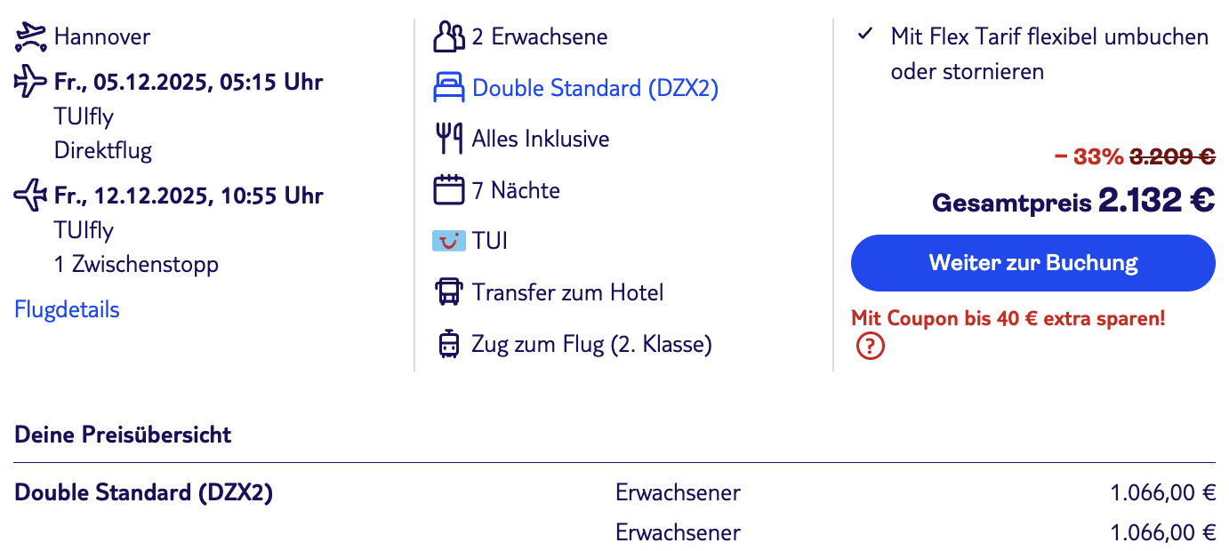 Tipp: Im Buchungsprozess wird dir ein Gutscheincode angezeigt, mit dem du je nach Reisepreis bis zu 80 Euro sofort sparst.
