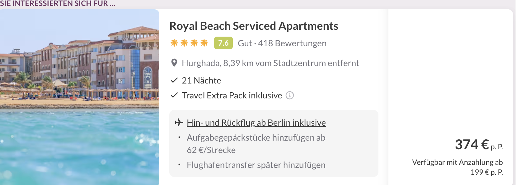 3 Wochen Urlaub mit Flügen im 4* Hotel für UNTER 400 € ist nicht schlecht oder? Also nicht zu lange überlegen und noch von krassen Frühbucher-Preisen profitieren. Schaut euch doch unten mal unser Beispiel an. Generell gibt es aktuell noch ein paar weitere Hotels für ein ähnliches Budget. Wählt einfach euren Favoriten aus. 🤩 Auch kürzere Zeiträume sind möglich!