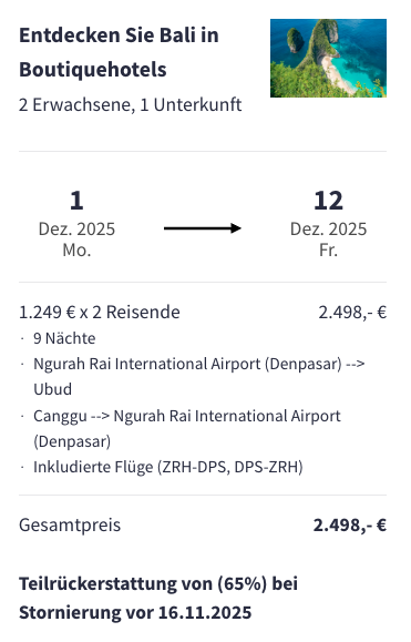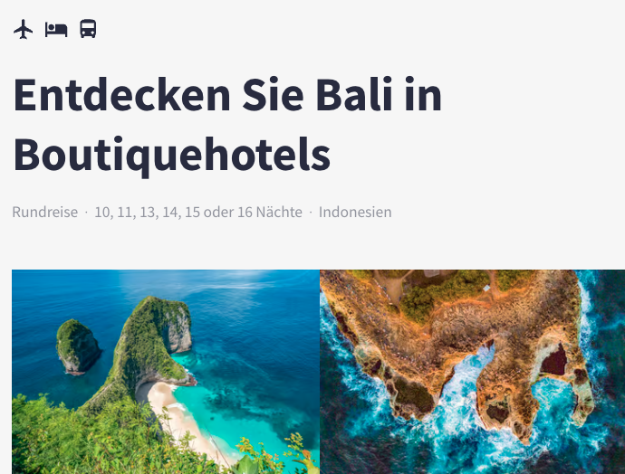 Ihr brecht auf zu einer atemberaubenden Rundreise nach Bali und Nusa Lembongan, wo ihr mindestens 9 Übernachtungen an drei verschiedenen Orten verbringt. Der Clou: Bei den Unterkünften handelt es sich um richtig schicke Boutique-Hotels. Weiterhin ist das Frühstück enthalten sowie die Flüge, Transfers und sogar noch Ausflüge. Den genauen Reiseverlauf seht ihr direkt in der Dealbeschreibung nach Weiterleitung. Weitere Ausflüge könnt ihr übrigens optional während der Buchung hinzufügen.