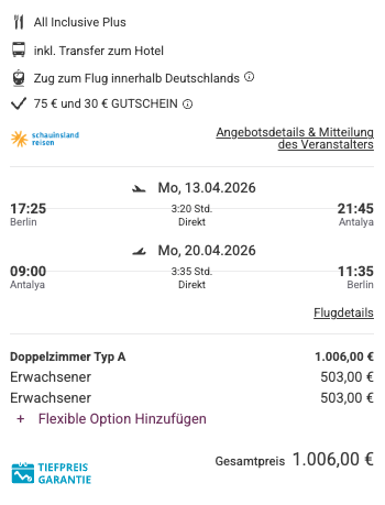 Alle hier genannten Reisepreise sind mit der Veröffentlichung des Deals verfügbar und buchbar, jedoch haben wir keinen Einfluss darauf, wann und wie stark sich ein Reisepreis verändern kann. Wenn die Nachfrage besonders hoch ist, kann der Flugpreis sich besonders schnell verändern und Unterkünfte ausgebucht werden.