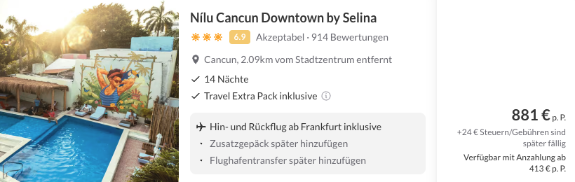 Mit diesem unschlagbaren Angebot geht es z.B. im Januar für 1 Woche nach Cancun 🤩. Ihr fliegt mit Condor und Air Canada von Frankfurt am Main und ab gehts ins beliebte Nilu Cancun Downtown by Selina.