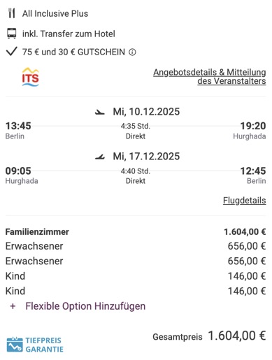 Das Angebot eignet sich auch perfekt für Familien: Für 2 Erw. + 1 Kind zahlt ihr insgesamt ab nur 1.168€. Für 2 Erw.+ 2 Kinder zahlt ihr ab nur 1.604€ im Familienzimmer mit Verbindungstür. Dafür müsst ihr nach der Weiterleitung einfach nur die Personenanzahl und das Alter eurer Kinder anpassen.